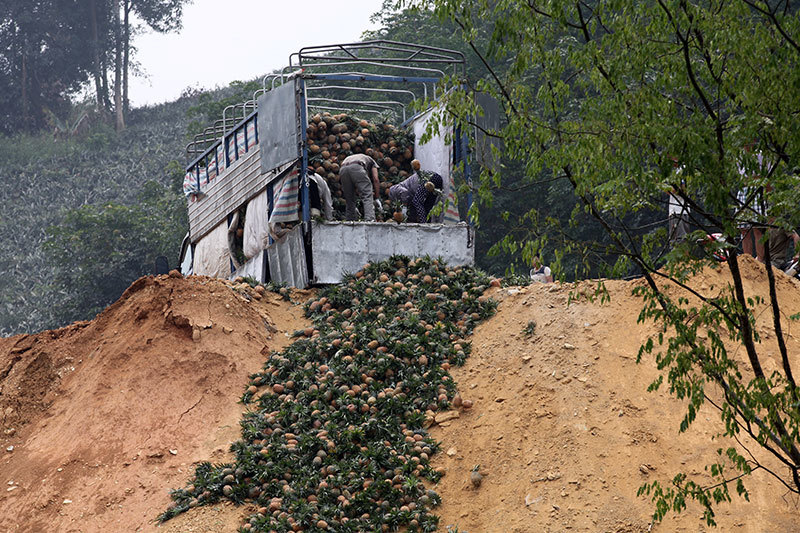 Người trồng dứa phải tìm đủ mọi cách tiêu thụ nhưng do nhu cầu trong nước thấp, hàng chục tấn dứa phải đổ đi, nhiều người buôn phải thuê người đem đổ với giá 1,5 triệu đồng cho một xe tải 10 tấn dứa.