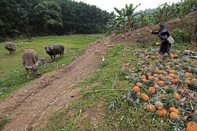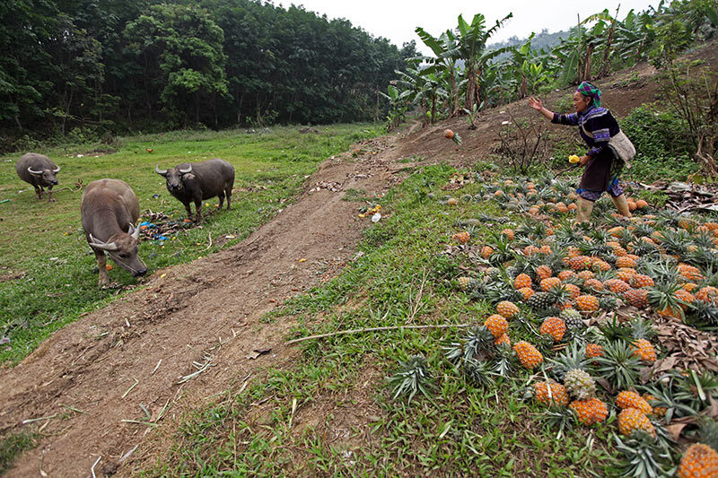 Người phụ nữ Mông này trong khi chăn đàn trâu tranh thủ nhặt dứa ăn.