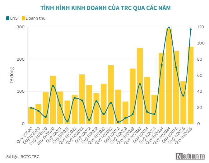 Kỳ này, doanh nghiệp có mức doanh thu từ hoạt động tài chính tăng gấp 2,6 lần, đạt gần 10 tỷ đồng. Chi phí tài chính tiết giảm chỉ còn 22 triệu đồng, trong khi con số của năm trước là 2,4 tỷ đồng. Đáng chú ý, quý III/2025 TRC đã ghi nhận khoản lãi 1,4 tỷ đồng từ công ty liên doanh, liên kết, cải thiện đáng kể so với mức lỗ gần 4 tỷ đồng của cùng kỳ năm 2024.