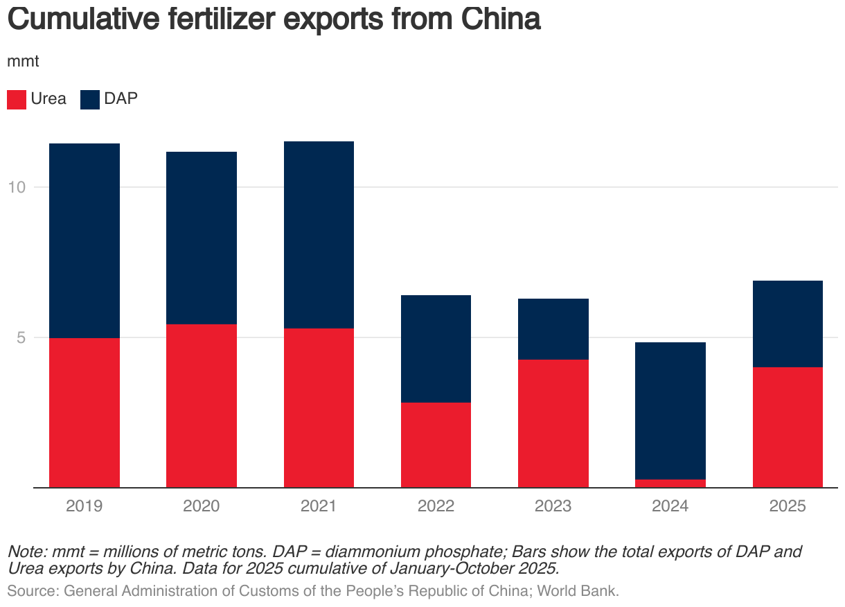 Ghi chú: mmt = triệu tấn (đơn vị mét). DAP = phân bón DAP (diamophos). Các cột thể hiện tổng lượng xuất khẩu DAP và urê của Trung Quốc. Số liệu năm 2025 được tính lũy kế giai đoạn tháng 01–10/2025. Nguồn: Tổng cục Hải quan Cộng hòa Nhân dân Trung Hoa; Ngân hàng Thế giới (WB).