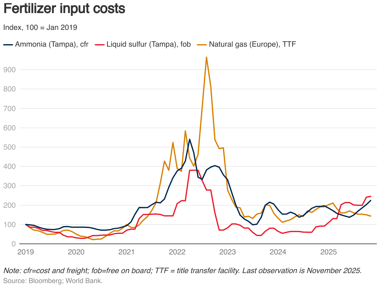 Báo cáo cũng chỉ ra rằng một số chi phí đầu vào đã tăng trở lại trong những tháng gần đây. Giá khí tự nhiên là nguyên liệu then chốt trong sản xuất phân bón nitơ, đã giảm 22% tại Hoa Kỳ và 26% tại châu Âu (tính theo USD) trong tháng 11 so với đầu năm. Ngược lại, giá lưu huỳnh dạng lỏng gần như tăng gấp ba lần kể từ cuối năm 2024, trong khi giá amoniac, sau khi giảm trong nửa đầu năm 2025, hiện đã tăng gần 15%. Những diễn biến này tiếp tục tạo áp lực tăng giá đối với một số mặt hàng phân bón.