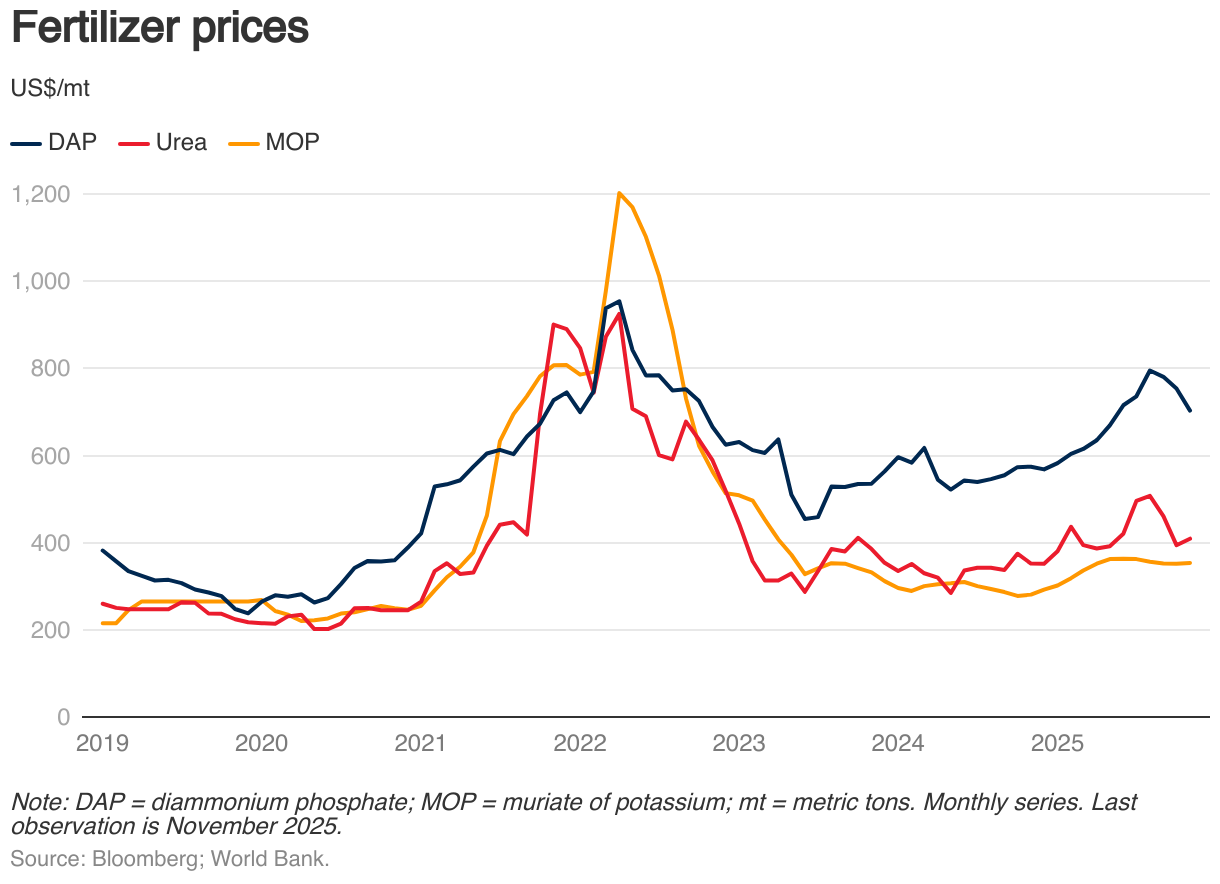 Ghi chú: DAP = phân bón DAP (diamophos); MOP = kali clorua; mt = tấn (đơn vị mét). Chuỗi số liệu theo tháng. Quan sát gần nhất là tháng 11 năm 2025. Nguồn: Bloomberg; Ngân hàng Thế giới (WB).