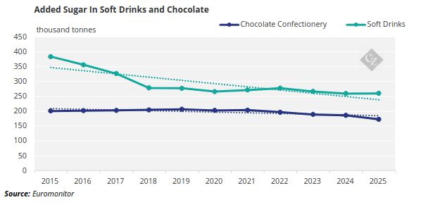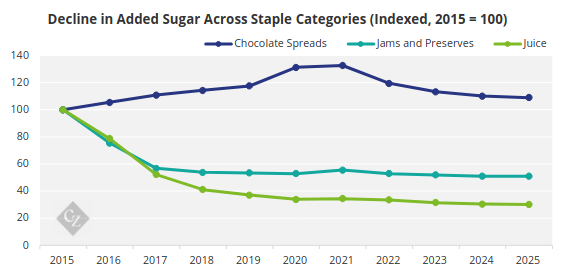 Dữ liệu theo nhóm sản phẩm cho thấy lượng đường bổ sung vào nước giải khát giảm mạnh trong giai đoạn 2016–2018, chủ yếu nhờ cải tiến công thức. Trong suốt 10 năm qua, bánh kẹo sô-cô-la vẫn là một nhóm sản phẩm ổn định và được ưa chuộng rộng rãi, bất chấp sự thay đổi thế hệ người tiêu dùng.