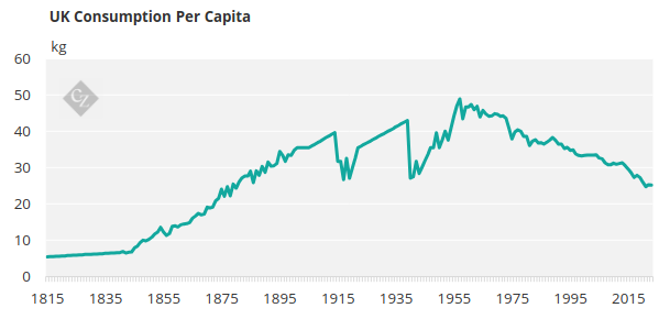 Tiêu thụ đường bình quân đầu người ở Anh tăng đều từ giữa thế kỷ XIX và đạt đỉnh vào những năm 1950–1960, khi đường trở nên rẻ hơn và dễ tiếp cận hơn. Tuy nhiên, trong khoảng 60 năm trở lại đây, xu hướng đã đảo chiều. Hiện nay, lượng đường tiêu thụ bình quân đầu người tại Anh chỉ còn khoảng một nửa so với mức đỉnh trước đây.