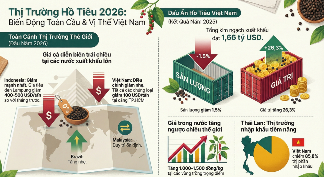 Biến động giá hạt tiêu thế giới trong giai đoạn này mang tính cục bộ, phản ánh sự điều chỉnh ngắn hạn hơn là đảo chiều xu hướng dài hạn. Đây là bối cảnh quan trọng để đánh giá triển vọng xuất khẩu và chiến lược thị trường của các quốc gia cung ứng lớn, trong đó có Việt Nam.