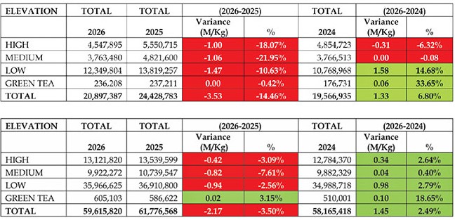 Tổng sản lượng chè trong tháng đạt 20,90 triệu kg, giảm 3,53 triệu kg (tương đương 14,46%) so với mức 24,43 triệu kg của cùng kỳ năm 2025. Sự suy giảm diễn ra trên tất cả các vùng sinh thái, bao gồm chè vùng cao, trung và thấp, cho thấy xu hướng giảm mang tính diện rộng.