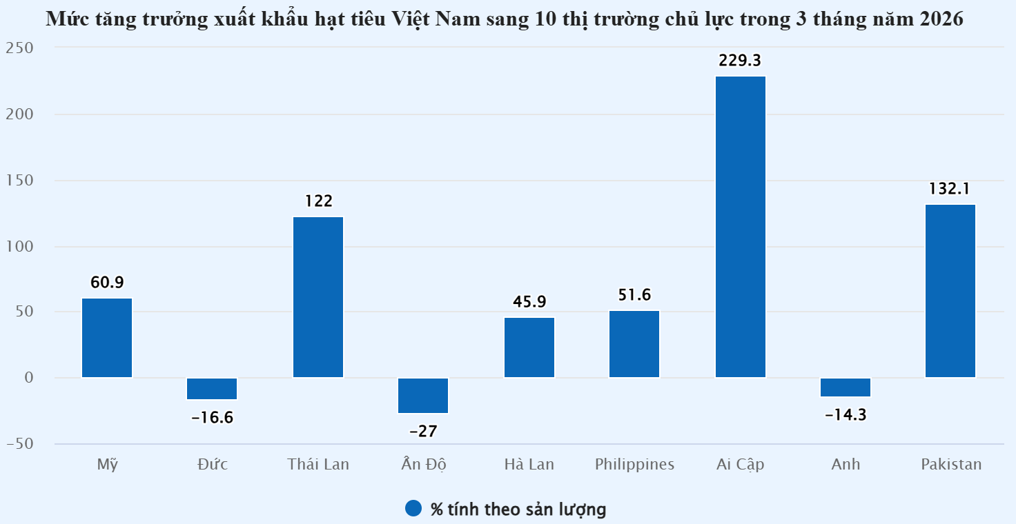 Xuất khẩu hạt tiêu sang Ai Cập cũng tăng đột biến 229,3% về lượng và tăng tới 205% về giá trị; trong khi xuất khẩu sang Pakistan có mức tăng lần lượt là 132,1% và 112,5%.