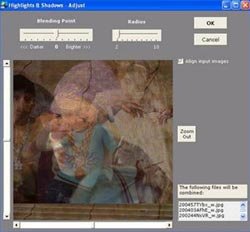 - Để trộn nhiều tấm ảnh số lại với nhau theo kiểu tự động canh lề sao cho vừa vặn nhất và có thể điều chỉnh được độ sáng - tối …thì bạn vào menu “Combine” -> chọn “Highlights & Shadows - Adjust” -> đánh dấu vào ô “Align input images” -> dùng thanh trượt “Blending Point” để chỉnh độ sáng tối của ảnh; dùng thanh trượt “Radius” để chỉnh độ nổi bật của một trong những ảnh số đã chọn và nhấn OK để hoàn tất.