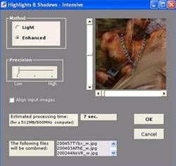 - Nếu bạn muốn trộn nhiều ảnh số với nhau ở mức độ chuyên sâu nhất, tức gần như tổng hợp toàn bộ các chức năng đã nêu trên thì bạn nên chọn tính năng “Highlights & Shadows - Intensive” trong menu “Combine” -> chọn phương pháp điều chỉnh là “Light” hoặc “Enhanced” và dùng thanh trượt ở ô “Precision” để điều chỉnh.